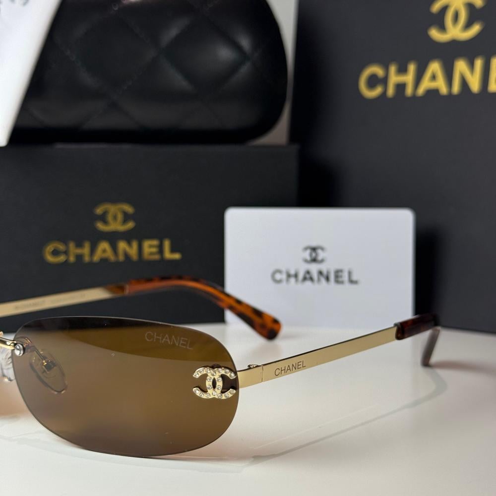 العدسات باللون البني الغامق بحماية عالية من أشعة الشمس، ويزينها شعار Chanel CC باللون الذهبي على الأطراف مع تفاصيل أنيقة مرصعة.